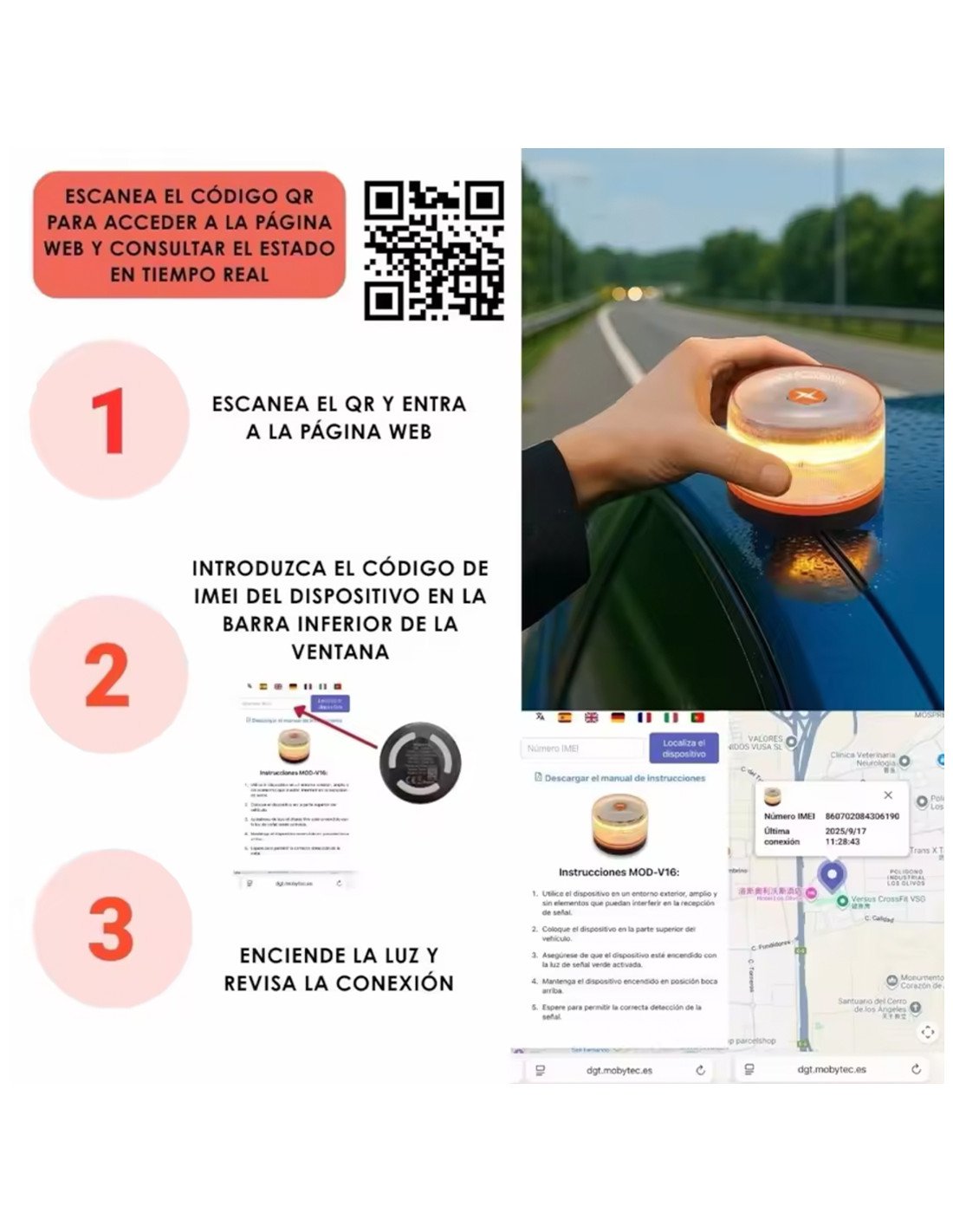 - Conexión y Geolocalización en Tiempo Real: Incorpora un sistema de geolocalización integrado que envía automáticamente la ubicación exacta del vehículo a la plataforma DGT 3.0 en caso de avería o accidente. Gracias a esta función, los servicios de emergencia y otros conductores pueden ser advertidos rápidamente, mejorando la seguridad vial y reduciendo riesgos en carretera.