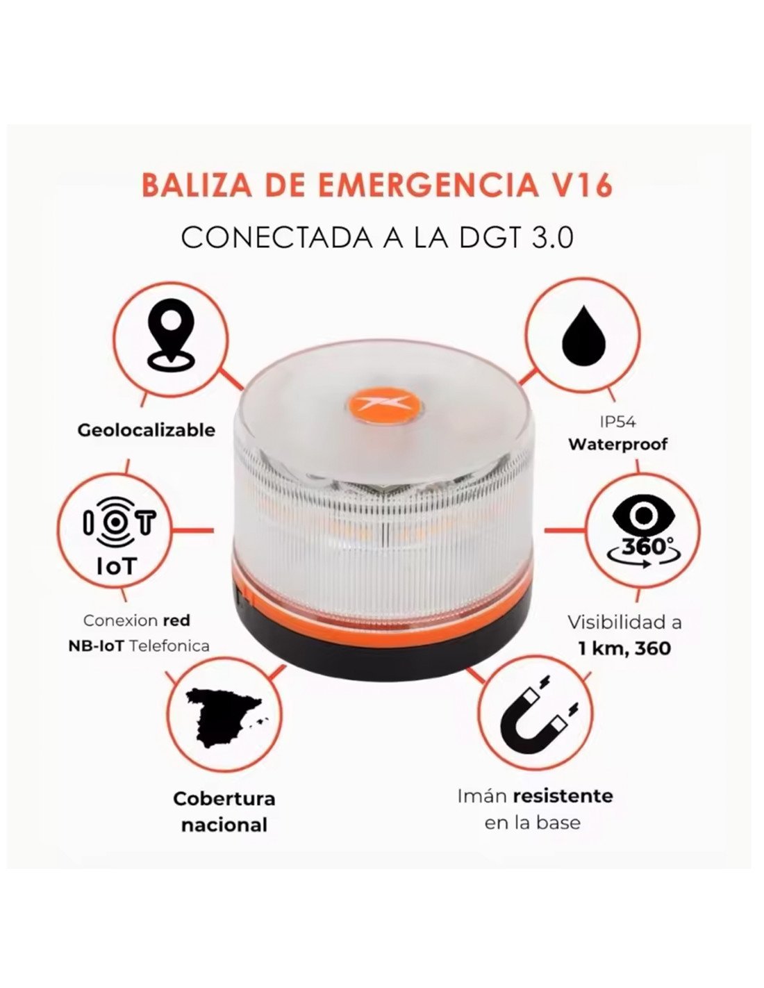 Diseñada con visibilidad de 360°, se activa en segundos y se puede colocar desde el interior del vehículo, evitando exposiciones peligrosas en carretera. Su certificación IP54 la hace resistente al agua y polvo, permitiendo su uso en lluvia, frío o condiciones climáticas adversas.